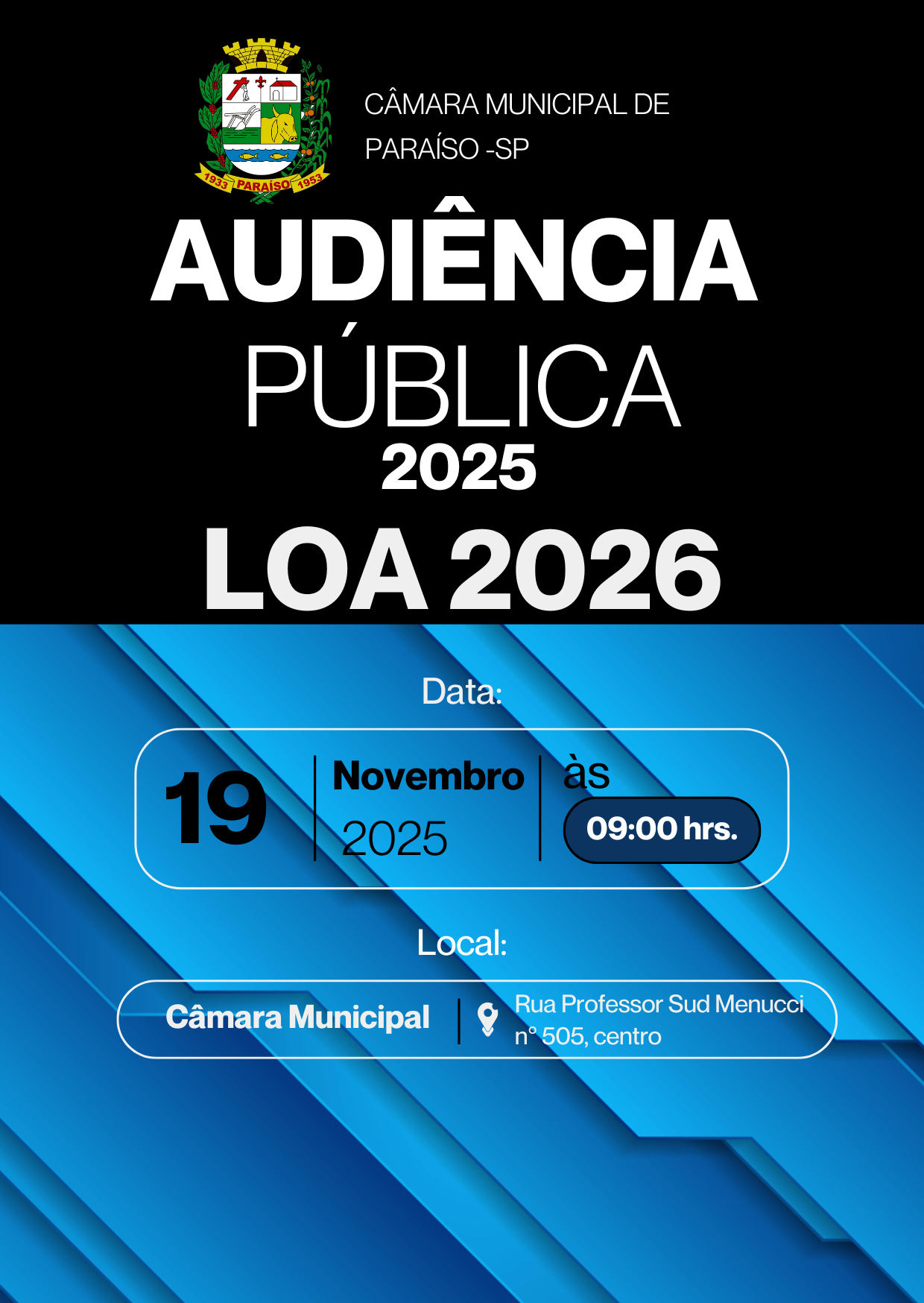 A Câmara municipal de Paraíso convida todos os cidadãos para participar da audiência pública da Lei Orçamentária Anual (LOA), que será realizado na próxima Quarta-feira dia 19/11 às 09:00 horas na Câmara municipal.